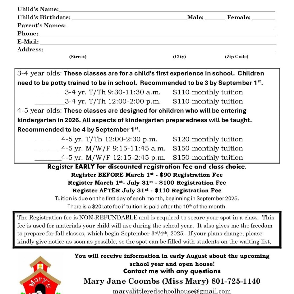 - Available February 1, 2025. The registration fee is NON-REFUNDABLE and is required to secure your spot in a class. This fee is used for materials your child will use during the school year.